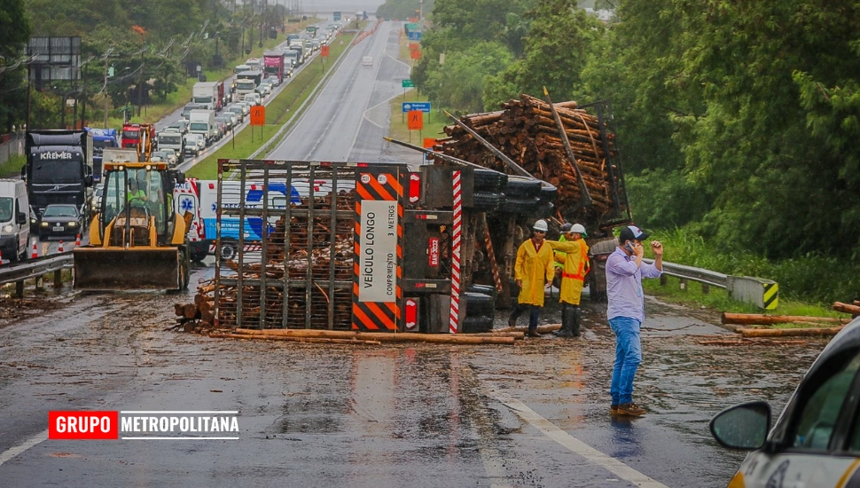 Trecho no Santa Terezinha ficou bloqueado desde a manhã após tombamento de treminhão; carga de madeira tomou as duas faixas.