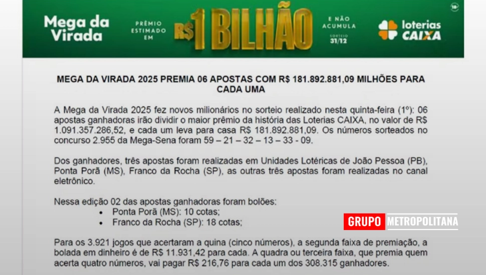 Seis apostas acertaram as seis dezenas do concurso especial da Mega da Virada e vão dividir o prêmio de R$ 1,09 bilhão, o maior valor já pago na história das loterias brasileiras. Cada bilhete premiado terá direito a R$ 181,8 milhões. As dezenas sorteadas foram: 09 – 13 – 21 – 32 – 33 – 59.
