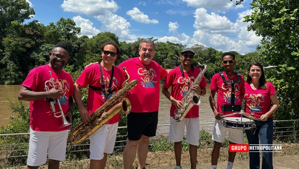 Secretários municipais de Cultura e Turismo, Carlos Beltrame e Clarissa Quiararia, junto da jazz band que se apresentou na Rua do Porto - foto: Divulgação