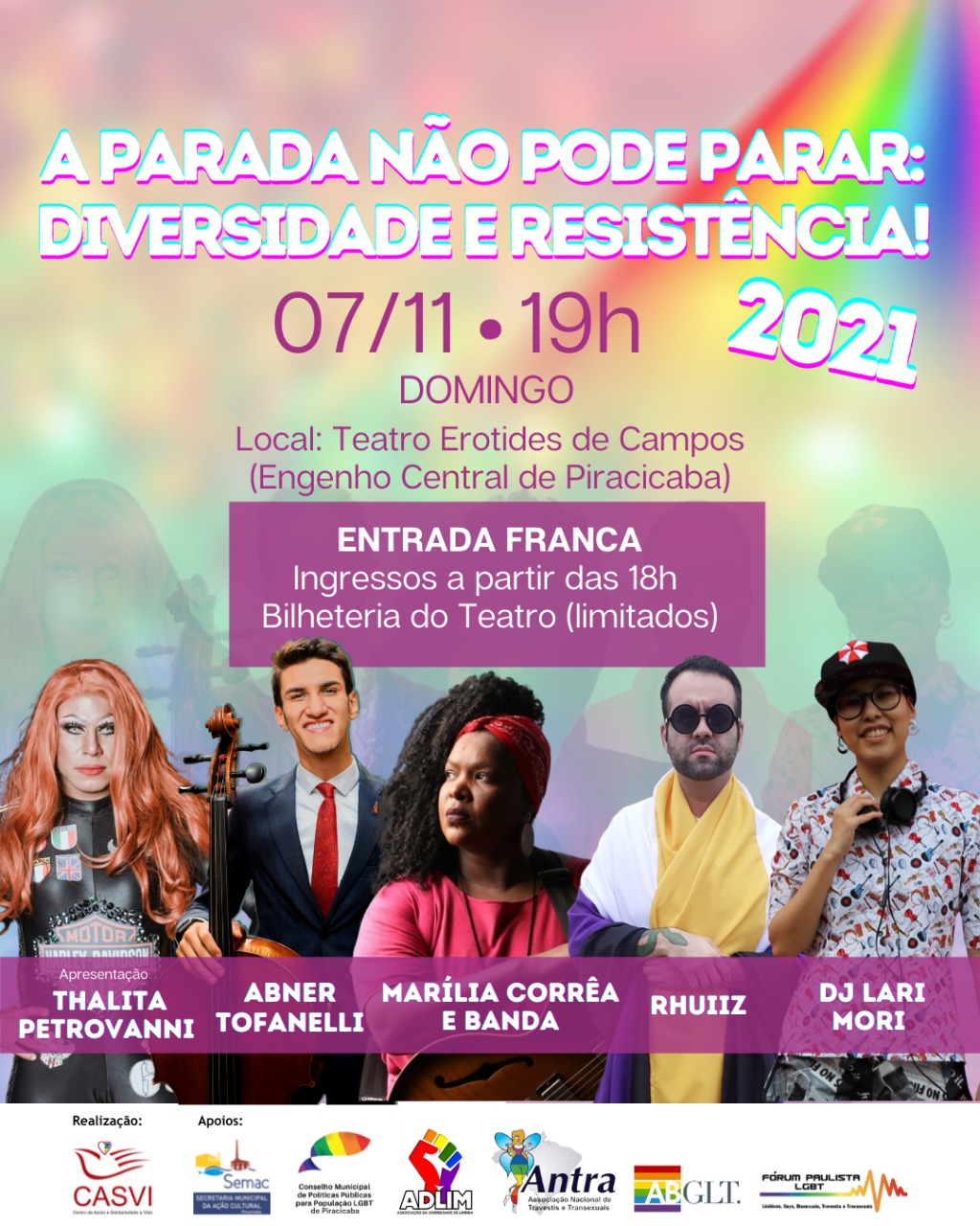 A realização deste evento é da ONG Casvi @ongcasvi, com produção de Anselmo Figueiredo @figueiredoanselmo, e apoio da Semac @semacpiracicaba, do Conselho Municipal de Políticas Públicas para População LGBTQIA+ de Piracicaba, Associação da Diversidade de Limeira (ADLIM), Associação Brasileira de Lésbicas, Gays, Bissexuais, Travestis e Transexuais - ABGLT @abglt.oficial Associação Nacional de Travestis e Transexuais @antra.oficial e Fórum Paulista LGBT.