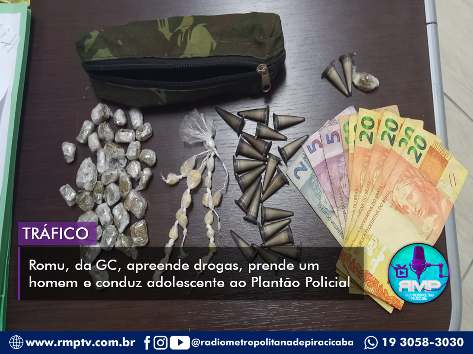 A Ronda Ostensiva Municipal (Romu), da Guarda Civil, apreendeu na manhã de terça-feira, 20/09, 21 pedras de crack, 21 pinos de cocaína e 33 porções de maconha num estojo escondido numa carroça, no Jardim Oriente. As drogas foram apreendidas e um homem e um adolescente foram encaminhados para o Plantão Policial. Eles responderão em liberdade por tráfico de drogas.