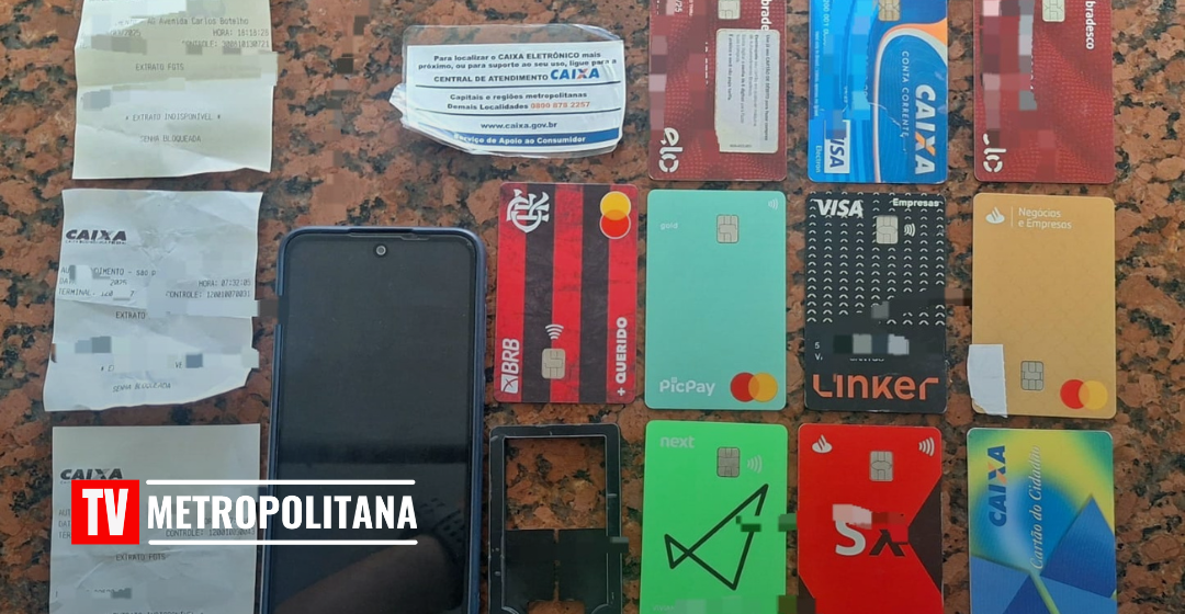 encontrados com a suspeita diversos cartões bancários e extratos. Questionada,