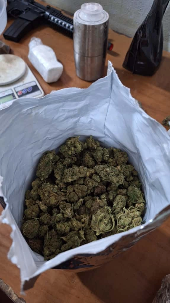 Na residência do suspeito, no Jardim Holiday, os policiais localizaram 2,054 kg de maconha, 647 g de cocaína, 0,55 g de uma substância conhecida como DRY, um revólver calibre .38 com numeração suprimida, 10 munições intactas, além de um simulacro de fuzil, R$ 825,40 em dinheiro, um celular e materiais para embalar drogas.