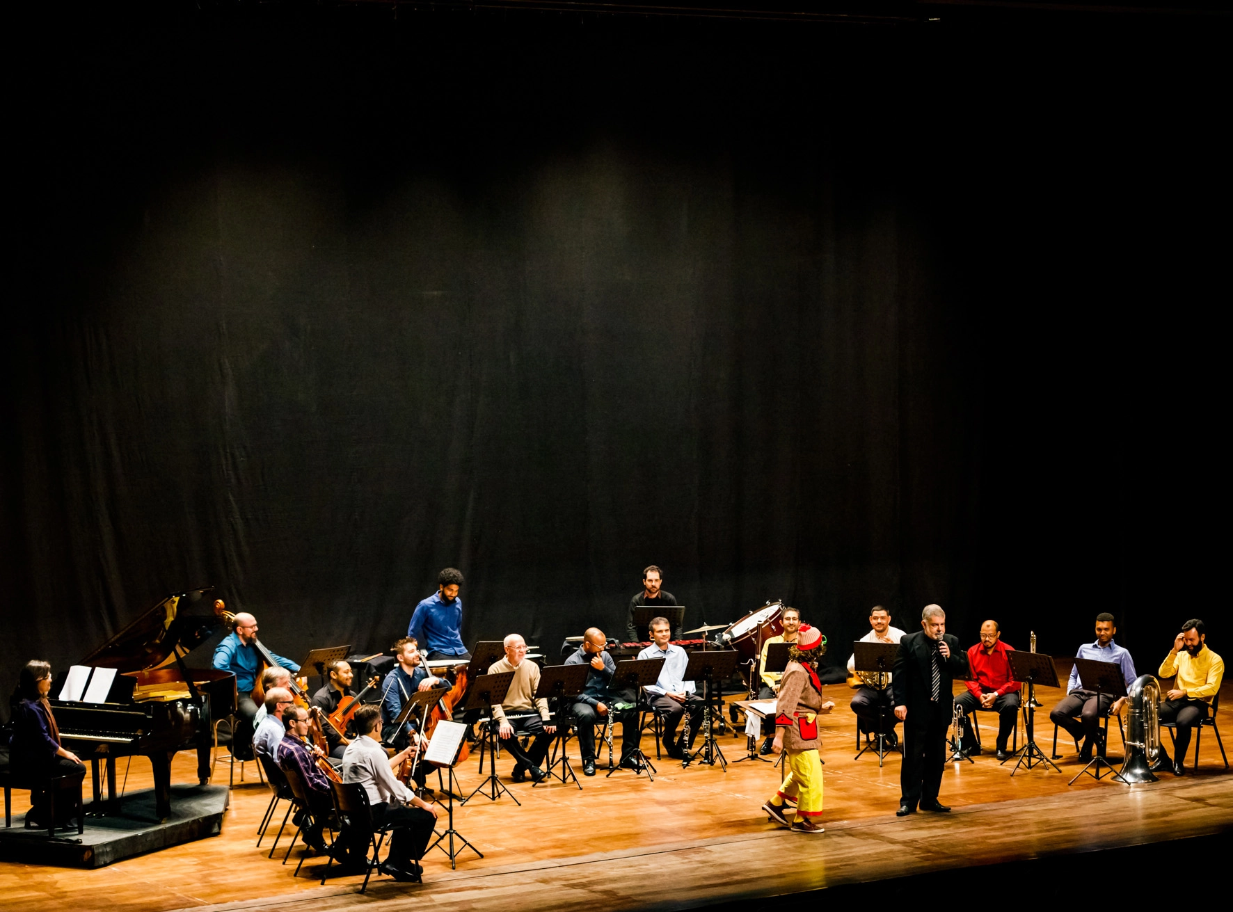 O espetáculo une música e teatro no palco, que reunirá diferentes instrumentistas. O violinista Luís Fernando Fischer Dutra é o intérprete do maestro e o ator Washington Poppi dá vida ao palhaço Zé da Batuta, que apresenta os instrumentos da orquestra e também suas famílias.