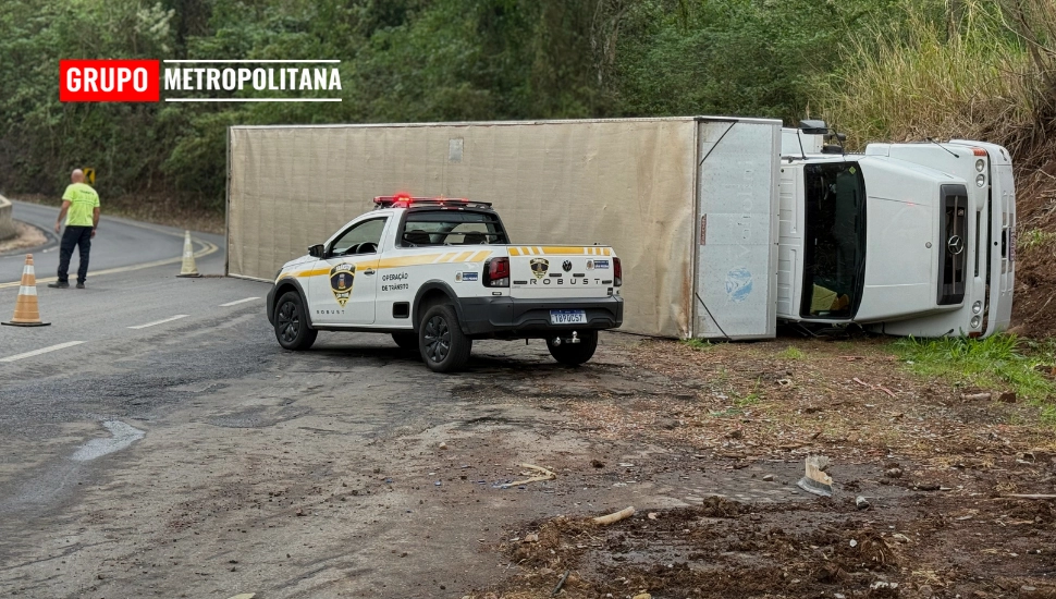 Um caminhão que transportava 3,5 toneladas de sofás tombou na tarde desta segunda-feira (27) na Curva do Coxo, um dos trechos mais íngremes da Serra de São Pedro (SP). Segundo a Guarda Civil, o motorista perdeu o controle do veículo durante a descida, provocando o acidente. Parte da carga ficou espalhada às margens da via.