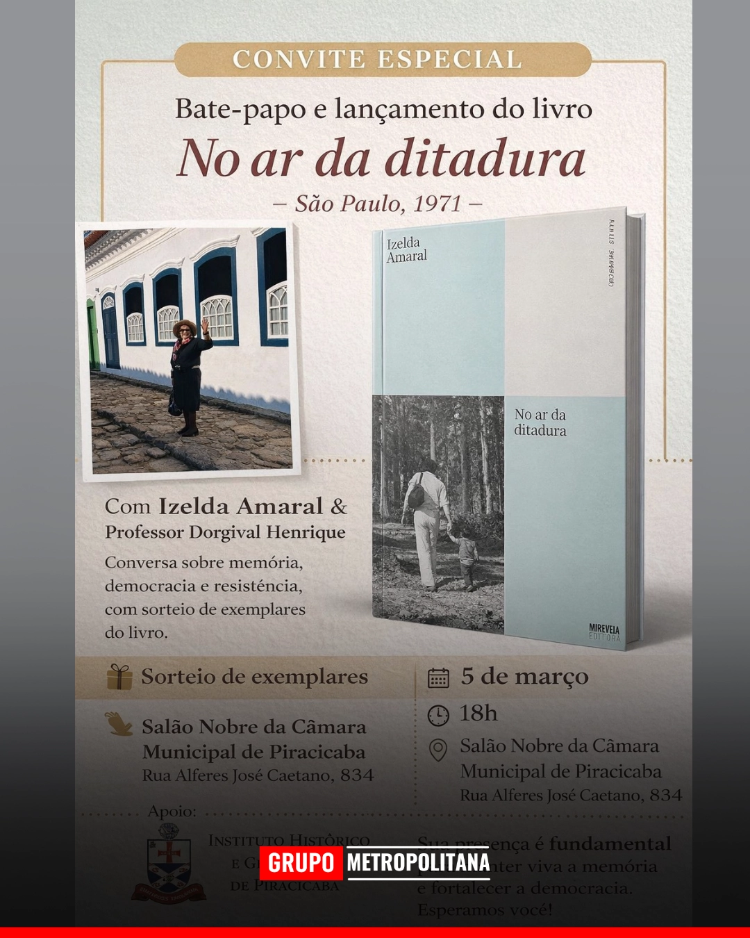 A autora vive fora do Brasil e está de passagem pelo País, o que torna o encontro em Piracicaba uma oportunidade especial de diálogo direto com o público sobre memória histórica e defesa da democracia.