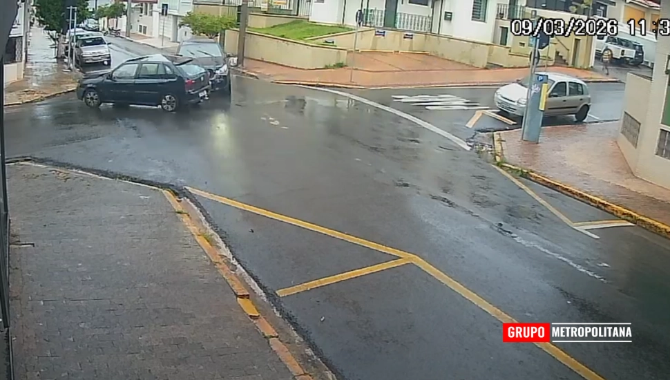 Segundo a Polícia Militar, um dos veículos avançou a sinalização de parada obrigatória e provocou a colisão; câmeras de segurança registraram o momento do acidente.