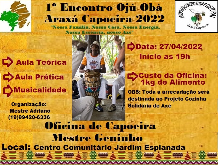 Neste próximo dia 27 de Abril, quarta-feira, a partir das 19 horas, acontece o primeiro Encontro Ojú Obà do Grupo Araxá Capoeira 2022, evento organizado pela Associação Desportiva e Cultural Araxá Capoeira que acontecerá no centro Comunitário do bairro Jardim Esplanada com aula teórica, prática e músicalidade da capoeira, o evento irá receber nesse mês de Abril como convidado especial o Mestre Geninho, capoeirista da cidade de Piracicaba e aluno do Mestre Cosmo o qual abordará o tema neste dia. Para o coordenador do grupo Araxá Capoeira Mestre e Ogan Adriano Rigo o evento vem somar a história do grupo Araxá Capoeira que há anos realiza aulas de Capoeira para jovens do bairro Jardim Esplanada de Segunda e quarta-feira a noite, não somente para jovens do bairro Esplanada, mas para quem quiser praticar a arte da Capoeira.
