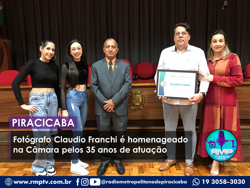 O fotógrafo Claudio Franchi foi homenageado, nesta quarta-feira (2), com a moção de aplausos 30/2022, de autoria do vereador Aldisa Vieira Marques, o Paraná (Cidadania), em solenidade realizada na Sala da Presidência. Com 35 anos de atuação, o profissional se destacou na cidade pelas imagens e coberturas fotográficas de casamentos e eventos sociais para catálogos, books e editoriais.