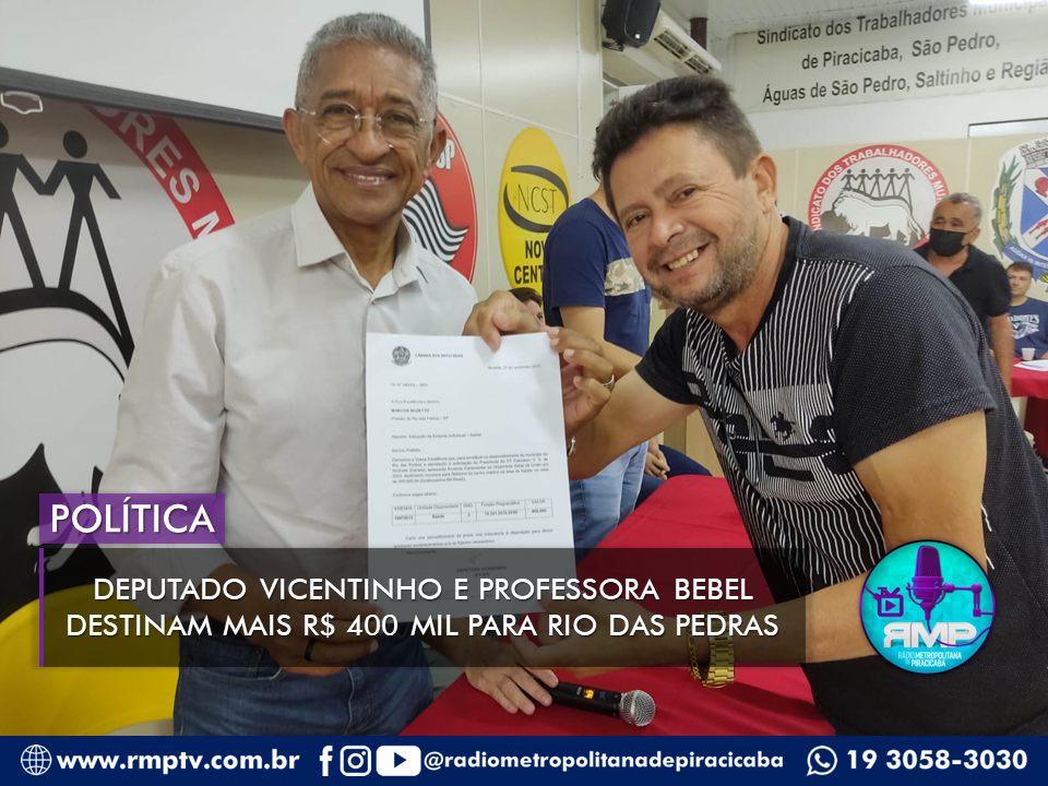 Em encontro com lideranças da região e do Instituto Conespi (Conselho das Entidades Sindicais de Pircicaba), em Piracicaba, no último sábado, 3 de dezembro, o deputado federal Vicente de Paula, o Vicentinho (PT), reforçou a manutenção da parceria com a deputada estadual Professora Bebel (PT) em prol da região e anunciou a liberação de mais R$ 400 mil para a área da saúde da cidade de Rio das Pedras. O recurso, fruto de emenda parlamentar, atende a pedido feito diretamente pelo presidente do PT de Rio das Pedras, o ex-vereador Wanderley Canela, que mantêm estreita relação com os deputados Vicentinho e Bebel.