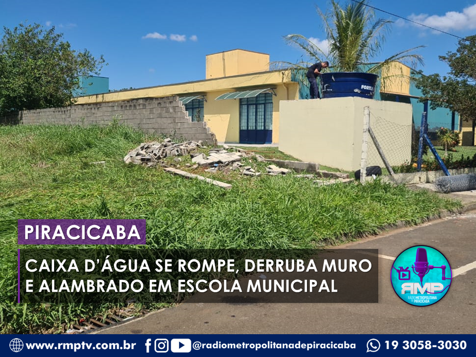 A caixa d'água que abastecia Escola Municipal de Piracicaba (SP) caiu neste sábado (1º) e se rompeu. Ela era confeccionada de fibra e armazenava 30 mil litros. No momento da queda, estavam no prédio funcionários da empresa contratada pela prefeitura para manutenção e obras nas unidades, ninguém se feriu.