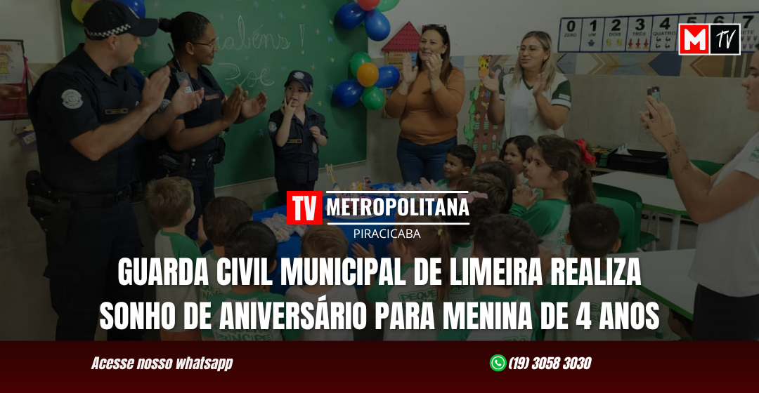 Na manhã desta segunda-feira (24), a equipe da Guarda Civil Municipal de Limeira, por meio do projeto Educar Limeira, realizou o sonho da pequena Zoe, que completou 4 anos de idade. A equipe visitou a escola onde Zoe estuda, participou da celebração de aniversário e presenteou a menina com uma réplica do uniforme da Guarda Civil Municipal de Limeira.