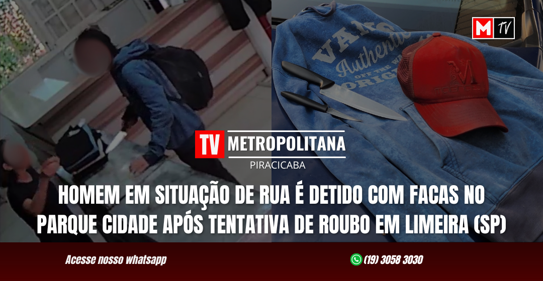 Na tarde desta segunda-feira (2), um homem que se identificou como morador de rua foi detido no Parque Cidade, em Limeira (SP), portando duas facas. A abordagem foi conduzida pelos guardas civis municipais Natanael e Bianchini, que patrulhavam o patrimônio público. O suspeito foi encontrado pelos guardas enquanto se banhava nos bebedouros do parque.