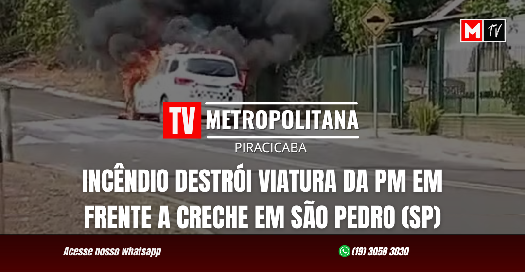 Na tarde de terça-feira (8), uma viatura da Polícia Militar foi consumida pelas chamas em frente à creche EMEB Maria Amélia Pimentel, localizada no bairro Floresta Escura, em São Pedro (SP).